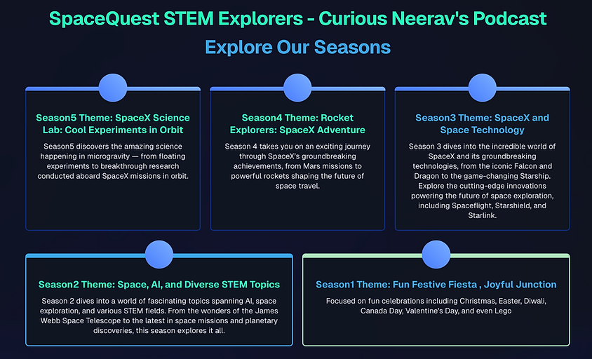 My SpaceQuest STEM Explorers journey began when I was just 9 years old, hosting my first podcast with my mom in December 2021. By January 2022, SpaceQuest was officially launched, and I'm thrilled to have completed four amazing seasons! Now, SpaceQuest is growing beyond the podcast with exciting new initiatives. Learn More.